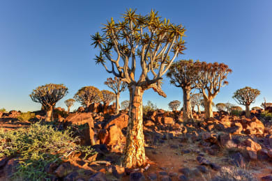 We enjoy another early start this morning as we pack up camp and head east. Our first official stop is at the well known Hell`s Bend viewpoint of the Fish River Canyon. Here we have the opportunity to overlook the second largest canyon in the world. The Fish River Canyon was formed millions of years ago by water erosion and the collapse of the valley due to movements in the earth’s crust After lunch we continue our adventure heading to our last destination; The Quiver Tree Forest. It is located just north east of Keetmanshoop and here approximately 250 quiver trees can be found. The forest grew spontaneously and the oldest trees are estimated to be around 200-300 years old. The Quivertree (Kokerboom in Afrikaans) is also Namibia’s national tree, and the forest was declared a national monument in 1995. The last night on our adventure is spent camping under the stars with meals prepared by our guide. This is an excellent location for photographing the stars should you be an avid photographer (permits are available for night photography of the quiver trees at additional cost)