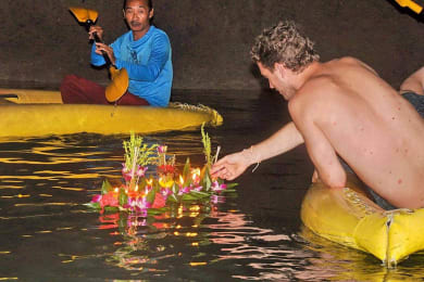“What's a Hong?” It's a sea cave. On this unique Phang Nga Bay tour you'll slowly glide into some hongs by canoe in the afternoon. Later, you'll watch a sunset... and then the magic happens. You'll hear the paddles dipping into the sea – glistening from a carpet of starlight above. Fireflies may add to the intrigue as you slip into one of the songs in the dark. Once there, Hong by Starlight re-creates the annual ceremony of Loi Kratong on every tour. You make your own floating candle to place in the water.... creating a sirenic illumination in the now-glistening cave.