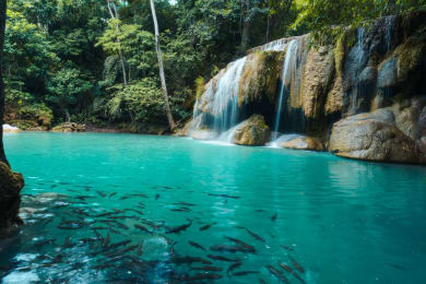 Today, you will visit one of the most beautiful parks in the country, Erawan National Park. Here, 7 waterfalls follow one another along a marked trail of about 2 kilometers. Erawan Falls are best to visit when the water level is high which is between September and December, right after the rainy season and before the dry season.