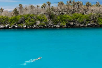 AM - Santa Fe island During your excursion at Santa Fe island, you will get surprised at how close to you some curious sea lions waddle. Likewise approachable for a close-up are Galapagos hawks that usually perch at their outlooks, ready to snatch away a baby marine iguana or lava lizard. We start next a cactus forest trail, that gives a close-up view on how these surrealistic, house-high giant opuntia prickly pears have grown out larger than on any other island and tell a fascinating evolutional story. At the calm, turquoise Barrington Bay, you can swim in close company with Galapagos sea lions, fluorescent blue chin parrot fishes, yellowtail surgeon fishes, whiptail stingrays, Pacific green turtles, whitetip reef sharks, and more. PM - Black Turtle Cove