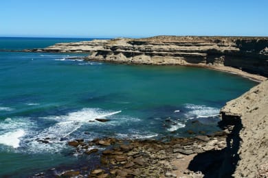 Admire the big extensions of the Patagonian landscape over the sea at El Pedral Penguin Colony