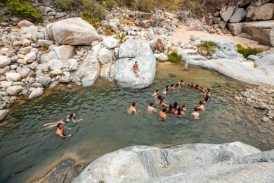 Wave goodbye to the coast as you venture into the heartland of Baja California Sur, the sublime Sierra de la Laguna. Traverse rugged terrains where desert flora frames every trail. Here, amidst the mountain whisper, find nestled oases, a serene retreat from the arid expanse. Follow the scent of wild herbs to waterfalls cascading into crystal-clear pools, inviting a rejuvenating dip. As the stars begin their nightly spectacle, your campsite turns into an al fresco gathering for connection and reflection by the campfire's gentle glow.