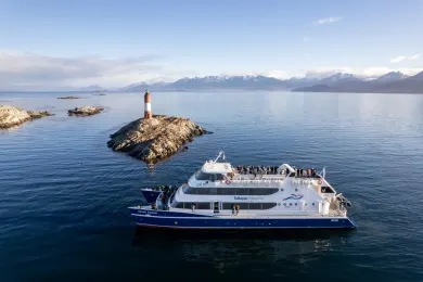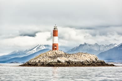 Continuing the journey, the boat heads towards Isla de Los Pájaros, home to Magellanic and Imperial cormorants, and a privileged area for spotting marine bird species. Later, we pass by the Les Eclaireurs Lighthouse, in the archipelago of the same name, where the ship Monte Cervantes sank in 1930.