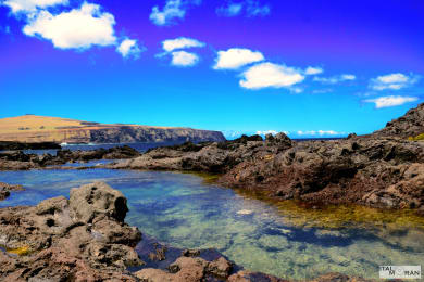 Departing from HangaRoa's town at about 9:30 am, going to the southeastern and northeastern coast of the Island visiting the AhuVaihu temple, which is located 10 km from HangaRoa. It consists of a stone platform with 8Moai statues and 8 pukao dispersed in the proximities. Then, we will go to AhuAkahanga, so- called the "Platform of the king". The legend tells that HotuMatua'a's tomb is near this place. There, we will find 4 platforms, 12 Moai statues, 8 Pukao and towards the interior of this Ahu; it is possible to see the best-preserved village of the island.