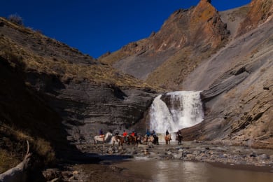 6-7 hours slow riding, trotting and cantering/28 KM Our destination today is Salto Las Chinas waterfall on the east side of Torres del Paine National Park, a route taken more than a century ago by Lady Florence Dixie whose 1880 account of traveling Patagonia has become iconic. As we ride across pampas and plateaus we may see condors matching our speed as they soar the skies above us. We’ll stop for lunch at the waterfall before making our way back to the ranch via the same trail.