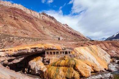 High mountain way consists of visiting, walking and enjoying Mendoza´s mountain’s immensity, highlighting its landscape richness, as well as the beautiful postcards offered by Potrerillos, Uspallata and Villavicencio. This road has a historical background, because it was the scenery of the Liberator army to Chile, which can be seen in Canota monument. Later we will visit Villavicencio´s hotel and then, we will go through its spirals. We will arrive at Los Penitentes ski center and to Puente del Inca to admire its fabulous geological shape and enjoy its hot thermal waters (2720 m.a.s.l.). Afterwards, we will stop at the “Mirador del Aconcagua” located in the international route and get from there the best view of Aconcagua, colossus of America (6959 m.a.s.l.). Then we will continue up to Las Cuevas, last Argentinean town before the border with Chile. Return to Mendoza. * Note: Tickets to enter the Aconcagua Provincial Park are not included, they are to be paid directly on site.