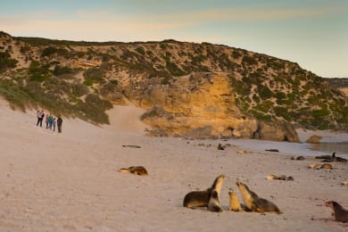 Depart Adelaide and enjoy a scenic coach trip through the Fleurieu Peninsula to Cape Jervis where you will board the SeaLink ferry for the 45-minute journey across Backstairs Passage to Kangaroo Island. On arrival in Penneshaw meet your local Driver/Guide. First stop is Rob's Shearing & Sheep Dogs to enjoy a sheep shearing demonstration by a real Aussie character before heading to Pennington Bay, a spectacular beach and a great photo opportunity. Continue to Emu Ridge Eucalyptus Distillery, the only commercial eucalyptus distillery in South Australia, where lunch will be served. Then visit stunning Seal Bay where you will have the opportunity to get up close to a wild breeding colony of rare Australian Sea-lions. You can watch them from the beach and learn how they withstand the rigors of the Southern Ocean. Not far is Little Sahara. Explore the huge white sand dunes and enjoy beautiful panoramas before testing your skills at sand boarding. Arrive at Vivonne Bay Lodge in the afternoon, where you will have the opportunity to spend some free time kayaking on the Harriet River, swimming at Vivonne Bay Beach, take a self-guided walk through the property tracks, go trail bike riding or simply relax. Back at camp there are complementary activities to keep you occupied before and after your BBQ dinner. As darkness sets, see kangaroos, Tamar wallabies and possums, relax around the fire (except in summer months) or kick back on the deck with a glass of local wine before retiring to the comfort of your bed. You will spend the night in a private room* with shared sanitary facilities
