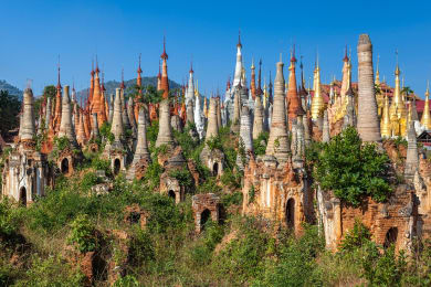 Breakfast at the hotel. Transfer to the airport for your flight to Heho. (NYU-HEH 09:05-09:45 Y5104). On arrival at Heho you will be met by your driver and guide for your transfer for your sightseeing. The ruins of Indein & home cooked food with a local family & canoe trip floating gardens -INL-002 – half day In the south of the lake the ruins of Indein are certainly worth a visit. Partly covered by vegetation the area looks like a “pagoda forest”. We will walk about 1 hour to enjoy a fantastic view over the lake. A home-made cooked lunch is served in a local house. We continue towards the Nam Pan village for a very interesting trip going local with a small canoe. Whenever you are tired paddling yourself we continue by motorboat back to your hotel.