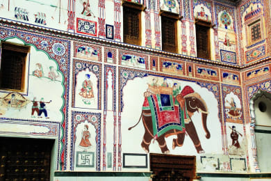 Breakfast at Hotel. Your tour begins with the drive to Mandawa in the middle of the Shekhawati region in northern Rajasthan. The sleepy desert region captivates with its romantic charm. In the unpaved streets of the former merchant town, one imagines oneself displaced in bygone times. The beautifully decorated merchants' houses, called Havelis, tell of the former wealth of its builders. Upon arrival check in at your hotel and late afternoon sightseeing of Mandawa Walk past the differently decorated Havelis and let the artful ornaments tell stories from everyday life, mythology and of the former inhabitants.