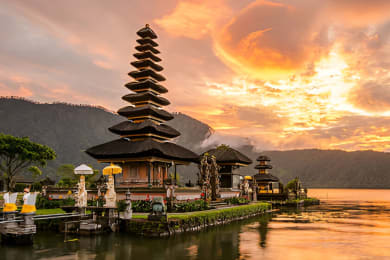 Ulun Danu Beratan Temple is one of Bali's most iconic landmarks on Lake Beratan in Bedugul. The temple is dedicated to the goddess of the lake, Dewi Danu, and is an important religious site for the Balinese. The temple complex is characterized by its distinctive multi-tiered meru shrines, set against the backdrop of the misty mountains and serene lake. Visitors to Ulun Danu Beratan can explore the temple complex, stroll along the tranquil lake shores, and take in the stunning natural beauty of the surrounding landscape