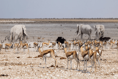Namibia's extraordinary animal kingdom reigns supreme in the vastness of the Etosha National Park. Today you explore this incredible wildlife paradise in your vehicle or, if you choose, with a guided game drive. You will need to pay for an entry permit at the park gate. The permit allows you access to the park for the day, and you can enter and exit as many times as you wish. The park's main feature is the enormous, white clay pan, and you are guaranteed to see hundreds of animals move between the many waterholes and natural springs that dot the landscape around the pan. Just sit and wait at one of the waterholes, and the animals will come to you. The best times for game viewing are mornings and afternoons when the animals are most active. You can choose to have lunch at one of the camps inside the park or picnic at a designated picnic area. Return to your lodge to relax in between your game drives.