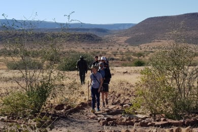 Leave the white dust of Etosha behind and travel into Damaraland. This part of Namibia's endless gravel plains and ephemeral rivers is home to desert-adapted lions, elephants, rhino and giraffes. Travel through the beautiful landscape, past Twyfelfontein and on to the Grootberg Massif. Keep your eyes peeled for wildlife that blend into their surroundings. Arrive at Palmwag Lodge in the afternoon to join your hiking guide for the next two days on the 400km² Etendeka Concession. All operations on this concession directly benefit the people of the Omatendeka and Anabeb Communal Conservancies. These communities live in remote and isolated areas bordering the concession in the north.
