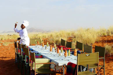 Early morning tea or coffee is served before sunrise, followed by a light breakfast so that you can start walking in the cool of the early morning. The "morning news", as written in the sand, is always fascinating. With some luck and the guide's trained eyes, you may spot some of the desert' specials' like the golden mole, dancing white lady, barking gecko, dune lark, flightless wasp, to name just a few. Learn how the fascinating desert flora survives, how insect and reptile life adapts to the harsh environment and how mammals survive here without water. Birding is surprisingly good, and you may be lucky enough to see one of Namib endemics, the dune lark. Larger animals you might come across include bat-eared fox, oryx, springbok and ostrich. For lunch, we will stop at a shady spot where you enjoy the treats prepared by our chefs and fill up your water bottles. There is plenty of time to relax, have a siesta and reflect on all you have seen. As the heat recedes, you start walking up and over the dunes to your second overnight spot. The scene in front of you is a sea of endless dunes and "fairy circles" against a backdrop of magnificent mountain scenery. A spectacular setting for photography! The shadows on the dunes create an ever-changing palette of colours shortly before sunset. A sundowner and a delicious dinner after a long and enjoyable day are indeed welcome. You might hear some barking geckos, owls or just the breeze and complete silence. Tonight we sleep out in the open under a blanket of stars. Walking time: Morning: 4 – 4.5 hrs. Afternoon: 2 – 2.5 hrs.