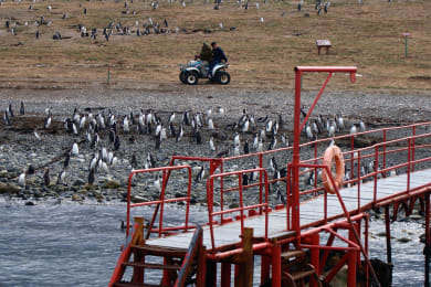 We set sail from the local tourist dock crossing the wide Ushuaia Bay until reaching the Beagle Channel through Paso Chico. There we sail around the Isla de los Pájaros where we will appreciate the fuegian avifauna observing Skuas, Black-browed Albatross, Steam Ducks, Cauquenes, Cook Seagulls and Gray Seagulls; and of the Isla de los Lobos where we can observe sea lions with one and two hairs. Both islands belong to the Bridges archipelago. When arriving at the Lighthouse Les Eclaireurs (The Illuminators), we will be able to appreciate the colonies of Imperial Cormorants and Rocky Cormorants; and also listen to the story of the collapse of the SS Monte Cervantes, which he starred in in 1930. Continuing, we will navigate towards the East enjoying the wonderful landscapes of the canal and the mountains that surround it, there we will see on the Puerto Almanza Argentina coast and on the Chilean coast the Puerto Williams Naval Base, and then we will arrive at Matillo Island where we will have the opportunity to see a colony of Magellanic Penguins and some examples of Papua penguins. Then we head to Harberton Ranch where we will disembark. There they will stay around 2hs, and they will be able to make a tour through the center of the ranch where they will visit the first natural reserve of Tierra del Fuego, the shearing shed, the carpentry, the boat house and, finally, the garden of the main house , then you can taste something in the Manacatush tea house (not included) or visit the Acatushún Austral Marine Mammal and Bird Museum. At the end we will board the buses of the company to make the direct transfer by land to the tourist pier. For operational and/or meteorological issues, the return to the city could be by sea. Note: at the beginning and at the end of the season you could see fewer penguin specimens.