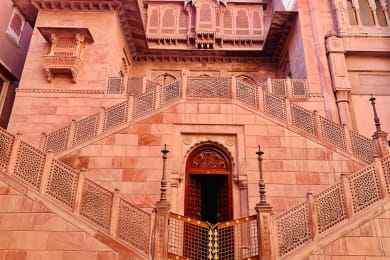Today the journey continues from Mandawa to Bikaner which is located in the heart of the Thar Desert. The city was once an important trading center on the ancient caravan route through Central Asia, and with its partially preserved walls, gates and historic buildings, it still conveys the image of a medieval desert metropolis. Camel carts, Tuk-Tuks and colorfully dressed people make up the picture here. Upon arrival, visit the massive Junagarh Fort, where visitors can admire more than 30 palaces, temples, and pavilions, and get a glimpse into the life of the ancient Mughals. we will visit the fruit and vegetable market and here we give you the opportunity to negotiate with the supplier with the help of Guide.