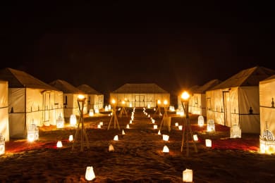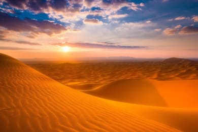 Enjoy breakfast at your hotel, before departing the five-hour drive towards the desert. First, you’ll stop at Kasbah Ait Ben Haddou-- A UNESCO world heritage site located in the foothills on the southern slopes of the High Atlas Mountains where parts of Game of Thrones were filmed. The fort of Ait-Ben-Haddou is a striking example of southern Moroccan architecture. The fort is a mainly collective grouping of dwellings, with imposing defensive walls that are reinforced by angle towers and pierced with a baffle gate. It is an extraordinary ensemble of buildings offering a complete panorama of pre-Saharan earthen construction techniques. You’ll have the optional opportunity to take an ATV ride around the Kasbah before continuing your drive to the desert. Upon arrival at your luxury desert camp, you’ll hop out of the car and onto the camels that will take you on a beautiful path through the tall sand dunes arriving into your luxury camp. Mint tea will be served as you arrive, after which you’ll have some time to enjoy the camp and contemplate the peaceful quiet of the Sahara. Dinner (included) will be served at your convenience, followed by a campfire and some live music by the camp’s staff who will perform tribal music for you. You can then enjoy the starlit sky before going to sleep in the comfort of your well-appointed tent.