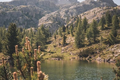 We take the bus to Giau Pass. Today's hike showcases the extraordinary diversity of the Dolomite Mountains. First, we follow a beautiful path to green pastures and we obsrve how the surrounding mountains are sharpened by the elements. We continue around croda del lago, an impressive steep vertical cliff, then, descend gently to lago di Federa. First, this path is panoramic, then you continue into a beautiful forest before returning to the road. Back to Cortina. Bus from Cortina to Giau pass: Around 30 minutes 6 hours of hiking Elevation: +800 / - 800