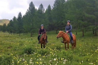 Today circle back and horse trek down through forest and steppe, crossing rivers and wild flower meadows. You will explore forest and mountain trails that are little travelled. Ride through beautiful mountains, muddy trails, forests and green meadows, with no one else around, only animals and birds. Today you may see red deer, moose, gazelle and it’s possible to come across bear and wild boar tracks. Overnight camping in tents or homestay with a nomadic family.