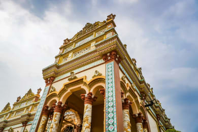 Upon arrival in My Tho, admire the exquisite and famously peaceful Vinh Trang Pagoda—a harmonious blend of Asian and European architecture, adorned with intricate sculptures and vibrant gardens.
