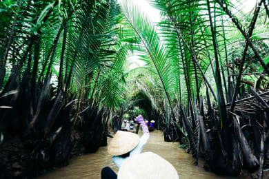 08:00 AM: Driver and guide come your hotel to pick up to Cai Be Floating market On arrival in Cai Be, set off by motorboat to visit the Cai Be floating market and watch the locals trading fruit and many other commodities on board their vessels. Visit a small family business to see how coconut candy and crispy rice popcorn are made. Then wander into the small villages to visit the orchard and fruit plantation, accompanied by traditional southern Vietnamese folk music. Keep cruising to a series of small canals to experience the charms of the Upper Mekong Delta. Arrive in Tan Phong island, relax on the hammocks to get back your energy, listen traditional songs for local people. Afternoon cycle around the village path with fruit orchards and bonsai garden. Meet the local islanders to learn more about the local daily life in the Mekong delta. Take a boat ride back to Cai Be then transfer back to your hotel in Ho Chi Minh