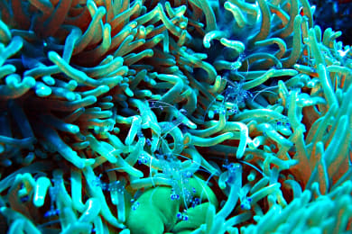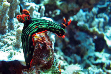 You travel north along the western coast of Cebu Island to Moalboal. Moalboal is among the best wall diving destinations in the country, with sheer faces that start at 15 feet (5 meters) and drop to 100 feet (30 meters) and beyond. The marine life is extremely varied and in your first dive for the day it is possible to see leaf scorpionfish, pipefish, schools of razor fish, and turtles. If you choose to do a night dive* there's a good chance of spotting ghost pipe fish and pleurobranchs.